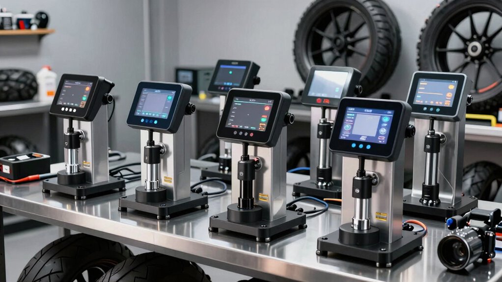 Additional functionalities like tire balancing and bead breaking can considerably boost your efficiency by allowing you to perform multiple tire maintenance tasks with a single machine. These features streamline your workflow, saving time and effort. Bead breakers, valve tools, and rim protectors make tire removal and installation easier and safer, reducing the risk of damage. Some machines come with adapters and adjustable components, so they can handle various tire sizes and vehicle types, increasing versatility. Integrated or optional tire alignment and centering tools ensure proper mounting, which minimizes the chance of damage or imbalance. Machines with multifunctional capabilities not only save space but also cut costs by combining several tasks into one piece of equipment. This all-around functionality helps you work faster, safer, and more efficiently.