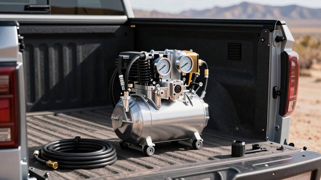 Choosing the right onboard air compressor kit isn’t just about the core components; it’s also about the extra features and accessories that can make the system more convenient and versatile. Wireless controls, remote operation, and programmable presets let me customize and operate the system effortlessly. Accessories like extra air hoses, quick-connect fittings, and inline pressure gauges expand its use for various inflation and suspension tasks. Safety features such as low-pressure sensors, over-current protection, and thermal cut-offs help prevent damage and keep operations reliable. Some kits include mounting hardware, in-cab control panels, or even mobile app integration, making setup and adjustments straightforward. Upgraded accessories like dual cylinders or weatherproof enclosures can boost durability and performance in demanding environments, ensuring my system is both flexible and resilient.