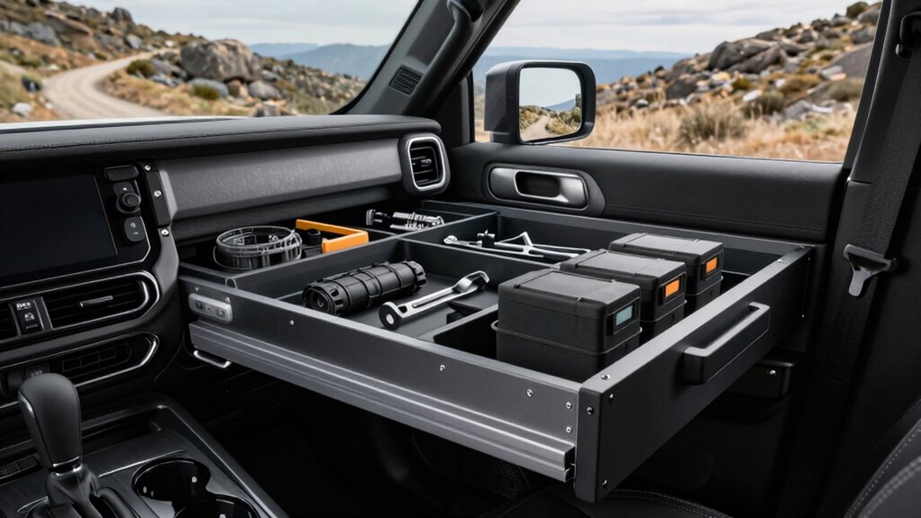 When selecting an overlanding drawer system for your SUV, organizational flexibility is key to adapting your storage to different trips and gear. Modular systems with interchangeable components let you customize your setup based on your specific needs. Adjustable drawer dividers and configurable compartments help organize gear of various sizes, making access easier and more efficient. The ability to add or remove drawers and accessories means you can tailor your storage for short getaways or extended adventures. Lockable drawers with secure latching keep your gear protected during transit and stops. Additionally, versatile mounting options and expandability allow seamless integration with your vehicle, maximizing space and ensuring your organization adapts effortlessly to different trip types and gear requirements.