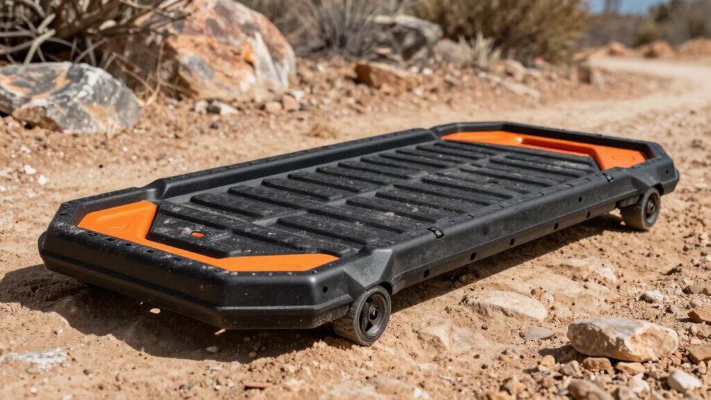 Choosing overlanding recovery boards requires careful attention to material durability standards, as these determine how well the boards can handle harsh conditions. High-quality recovery boards are built from automotive-grade polymers and reinforced nylons, which withstand impacts, abrasive terrains, and extreme weather. UV resistance and aging resistance are vital, preventing degradation from prolonged sun exposure and environmental factors. A key benchmark is the ability to bend up to 120° without damage, showcasing flexibility and toughness. Additionally, durable materials are tested across temperature ranges from -30°C to 60°C, ensuring reliable performance in diverse climates. When selecting recovery boards, prioritize those that meet strict durability standards to guarantee longevity, safety, and effectiveness during your off-road adventures.