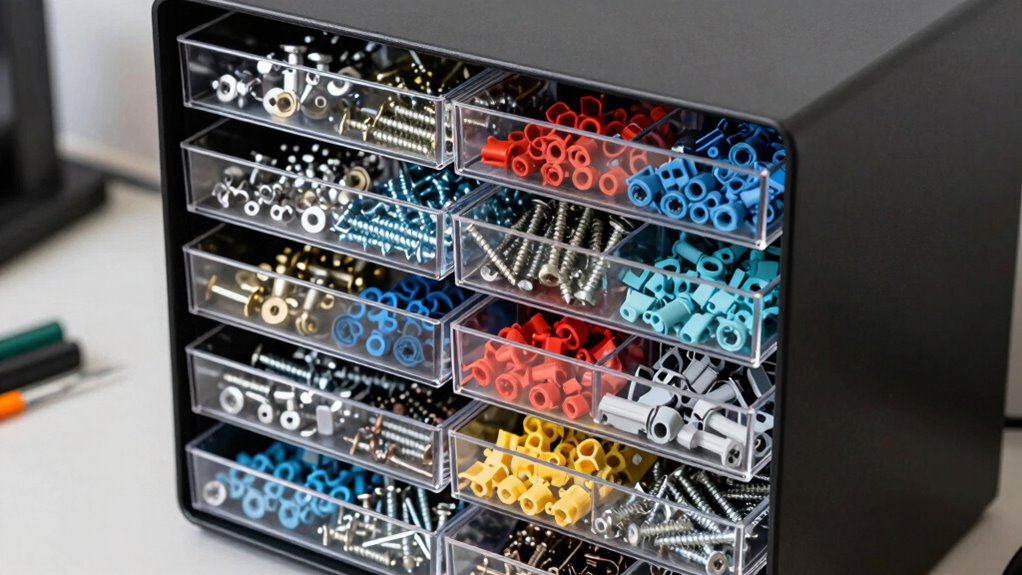 Choosing the right parts organizer can make a huge difference in your workspace. Imagine a hobbyist who upgrades to a modular cabinet, finding it easier to locate small screws and nuts quickly, saving time and frustration. Whether you opt for a compact wall-mounted unit or a large metal cabinet, considering your needs guarantees better organization and efficiency. Investing wisely means you’ll always have the right part at your fingertips when you need it most.