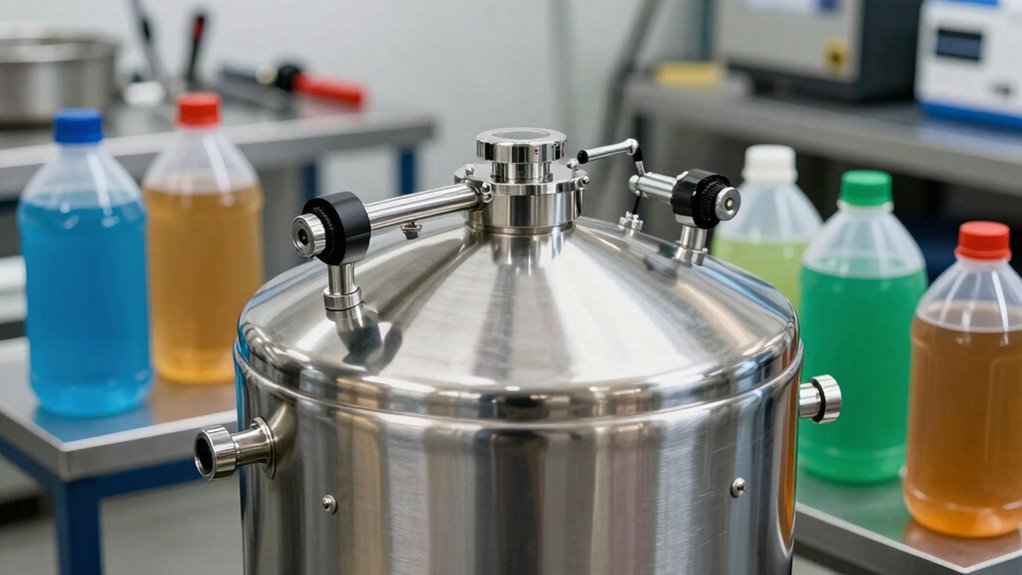 Choosing the right parts washer solvent tank hinges on understanding how well the tank material interacts with your cleaning solvent. I look for tanks made from materials compatible with the specific chemical properties of my solvent, guaranteeing corrosion resistance if it’s aggressive. It’s essential to verify whether the tank suits water-based or oil-based solvents to prevent deterioration and safety issues. I also check if the seals and gaskets are compatible with my solvent type, avoiding leaks or degradation over time. For solvents with high vapor pressure or flash points, I select tanks made of fire-resistant or vapor-tight materials to enhance safety. Ultimately, I guarantee the tank’s design and material chemistry align to prevent reactions that could compromise its integrity or cleaning performance.