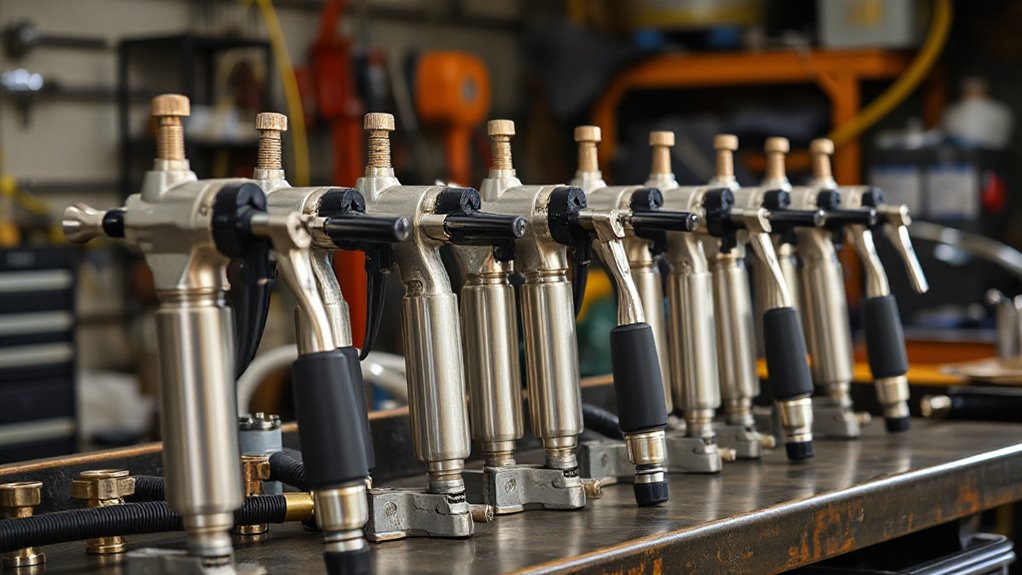 When evaluating pneumatic grease guns, ease of operation is a top priority because it directly impacts efficiency and safety. A user-friendly trigger mechanism that allows smooth, one-handed use makes the job faster and reduces fatigue. Adjustable flow control valves are essential—they let me fine-tune grease flow without pausing, enhancing precision. An ergonomic handle with rubber grips or contoured shapes improves control and comfort during extended use. Clear, straightforward loading and refilling procedures save time and minimize errors, keeping the workflow steady. Additionally, quick-connect fittings and flexible hoses make attaching and maneuvering the gun easier, especially in tight or hard-to-reach spots. Overall, these features ensure seamless operation, boosting productivity and reducing user strain.
