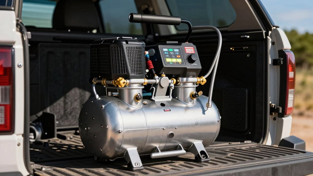 If you’re looking for the 15 best portable 12V dual-cylinder air compressors for 2026, I’ve found some top contenders that offer rapid inflation, durable build quality, and advanced safety features. These models excel at inflating tires quickly and safely, with digital controls, pressure gauges, and versatile accessories. They’re suitable for automotive, recreational, and outdoor use. Stick with me to discover detailed reviews and tips to pick the perfect compressor for your needs.