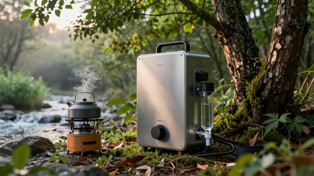 Portable water heaters are designed to handle variations in water pressure, but performance can vary. I recommend choosing models with built-in pressure regulators or safety features that adjust to fluctuating pressure levels. When camping, I always check the specifications to make sure the heater can accommodate the pressure of the water source. This way, I avoid issues like leaks or malfunctions, guaranteeing a steady supply of hot water wherever I go.