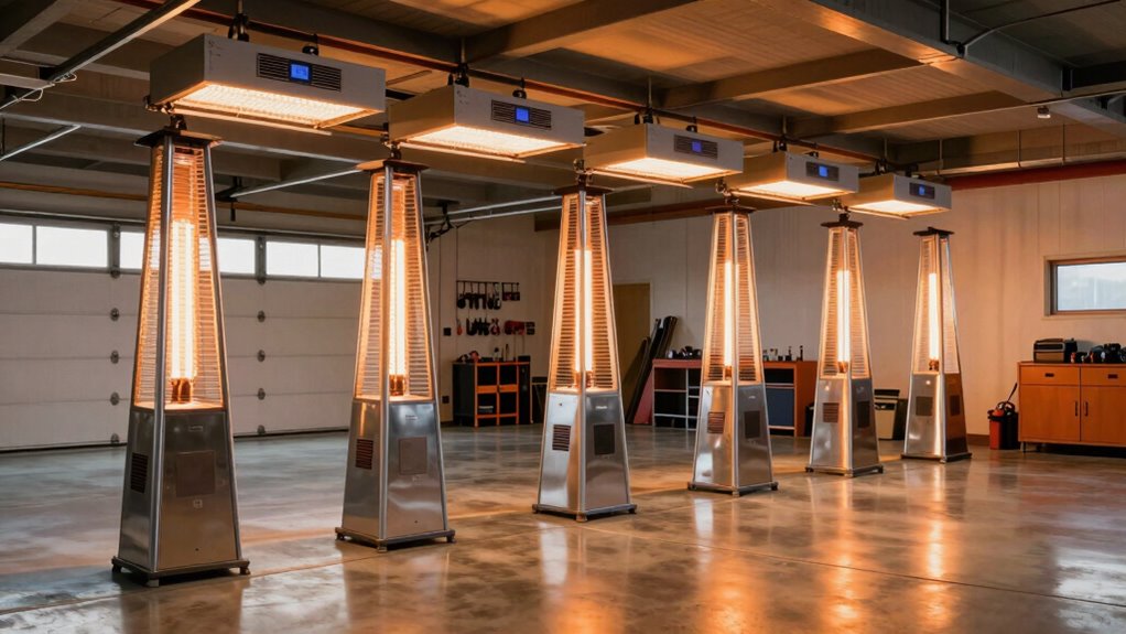 Using high output propane garage heaters indoors is like dancing on a tightrope—they’re powerful but need proper safety measures. I wouldn’t recommend using them without adequate ventilation because they produce combustion byproducts. Always guarantee your space has good airflow and follow manufacturer guidelines. While they’re effective for heating, safety first! Installing carbon monoxide detectors and ensuring proper venting helps you enjoy warmth without worries.