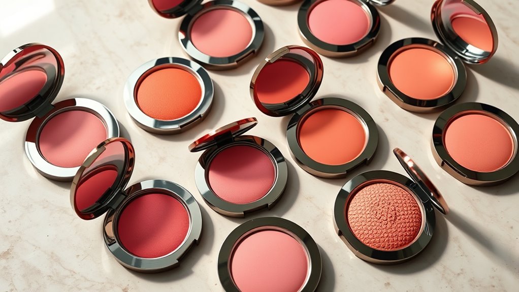 Matching the shade isn’t enough; the texture and finish of a blush considerably influence how natural and seamless it looks on your skin. A dupe with a creamy or gel-like texture applies smoothly and blends effortlessly, creating a more natural glow. Powder formulas can vary from matte to luminous, so choosing one that matches your preferred finish is key. A satin or dewy finish adds a fresh, radiant look, while matte offers a more subtle, velvety appearance. A smooth, buildable texture prevents caking and patchiness, making layering easy. Additionally, lightweight, breathable formulas often last longer and don’t settle into fine lines. Consider your skin type and desired effect when selecting a dupe, ensuring the finish complements your overall makeup look.