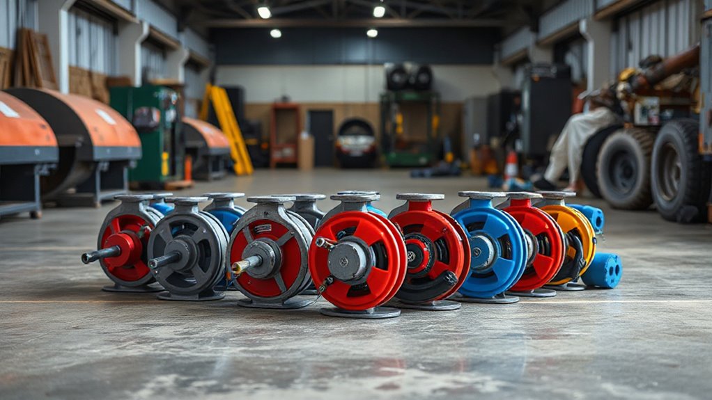 When choosing heavy-duty reels, I look for safety features like automatic shut-off valves to prevent accidental air release and sturdy locking mechanisms that keep the hose securely in place. Non-slip bases are a must for stability, and some models include crush-resistant hoses for added durability. These features help guarantee safe operation, reducing risks of accidents while maintaining efficiency on the job site.