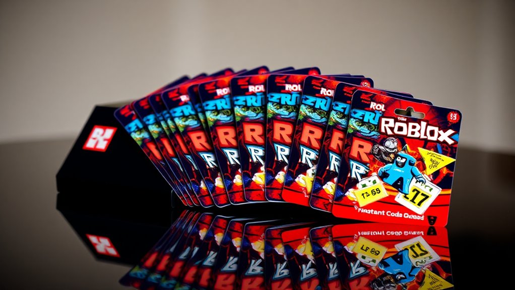 If you’re looking for the 10 best Roblox gift card digital codes for instant gaming fun, I’ve got you covered. These include various amounts like 1,500 to 60,000 Robux, plus exclusive virtual items and bonuses to boost your gameplay. Digital options are quick and easy to redeem worldwide, making them perfect gifts or personal upgrades. Stick around, and I’ll share more details to help you pick the perfect code for your gaming needs.