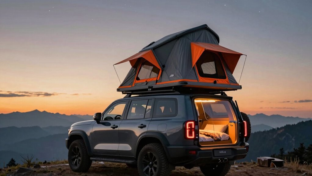 Have you ever struggled with comfort inside a rooftop tent after a long day of outdoor activities? If so, you’ll appreciate the importance of interior comfort options. Many tents feature multi-layer mattresses with rebound foam and condensation pads, which notably improve sleep quality. Ventilation is equally essential; mesh windows, skylights, and adjustable vents help maintain airflow and regulate temperature, keeping the interior cozy. Integrated LED lighting and multiple access points make moving around easier and improve visibility at night. Privacy features like blackout fabric and curtains allow you to customize light levels and privacy, enhancing your rest. Plus, spacious interiors with high headroom—often over 42 inches—offer more comfort and room for gear, making your outdoor experience more enjoyable.