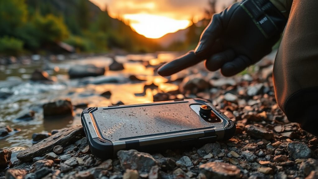 Choosing a rugged smartphone for outdoor work means prioritizing durability standards that can handle tough conditions. I look for devices that meet military-grade standards like MIL-STD-810H, ensuring they withstand drops, shocks, and vibrations. Waterproof ratings such as IP68 and IP69K are essential, providing protection against water immersion and high-pressure jets, which are common outdoors. Dustproof certification guarantees the phone can operate reliably in dusty or sandy environments, preventing internal damage. Drop resistance from at least 1.2 to 2 meters is vital because falls happen often. Reinforced construction, with sealed ports and shock-absorbing materials, further boosts resilience. These standards give me confidence that the device can survive harsh conditions and keep performing reliably in demanding outdoor settings.