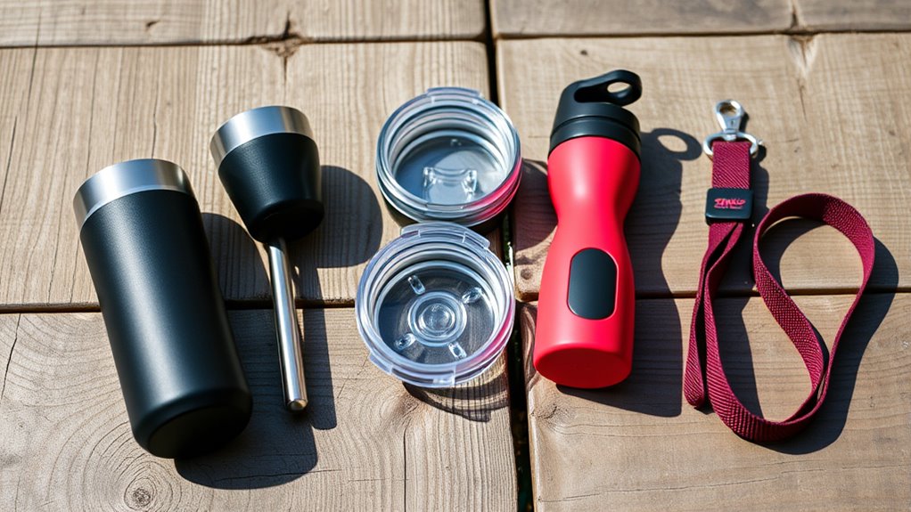 Think of accessories as your tumbler’s trusty sidekicks—yes, they can substantially prevent leaks and spills when used correctly. I’ve found that sealing lids, silicone sleeves, and spill-proof straws create an effective barrier against messes. Just make sure everything fits snugly, and always double-check the seals. When properly equipped, your tumbler becomes leak-resistant, making your adventures mess-free and worry-free.