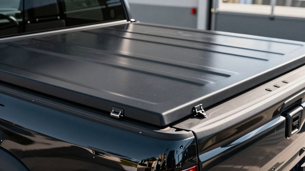 Selecting a hard folding tonneau cover that stands up to daily wear relies heavily on the materials used. High-quality options like fiberglass, aluminum, and reinforced polymers substantially boost durability and lifespan. These materials resist UV rays, scratches, dents, and extreme weather, helping maintain the cover’s integrity over time. The thickness and density of the panels are also vital, as they determine how well the cover withstands heavy loads and impacts. Reinforced locking mechanisms and sturdy hinges made from durable metals ensure security and prevent early wear or failure. Additionally, proper sealing and weatherproofing features protect your cargo from moisture, dust, and debris. Choosing materials with these qualities guarantees your tonneau cover remains functional, secure, and long-lasting, even under tough conditions.