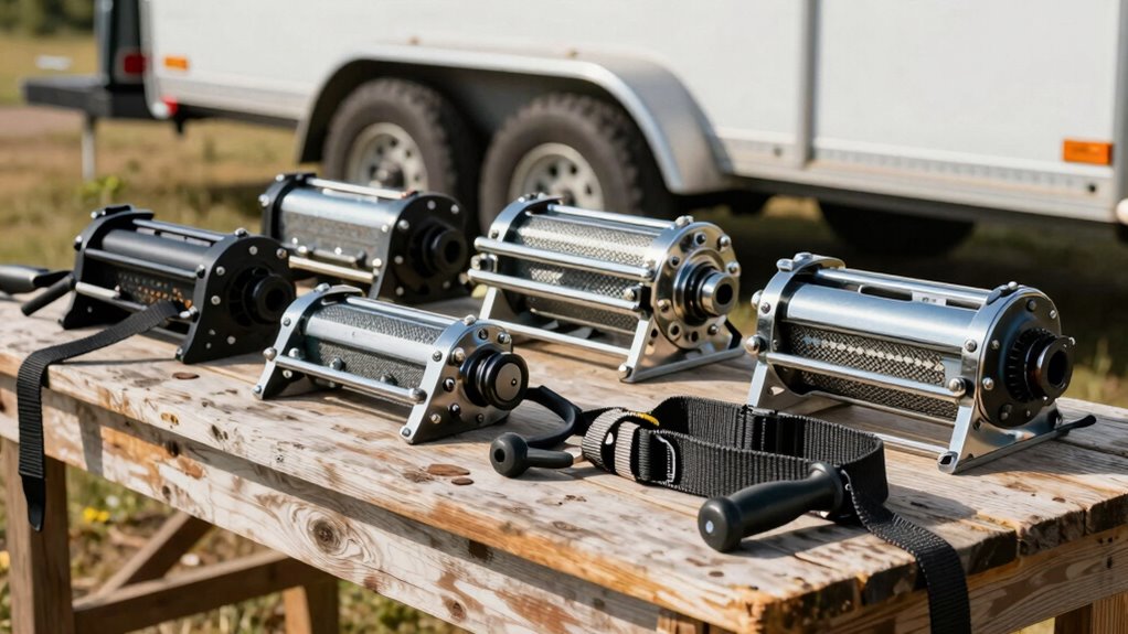 Choosing the right trailer winch hinges on understanding your power capacity needs, which depends on the loads you’ll be recovering or moving. I start by determining the maximum weight I expect to handle, ensuring the winch’s pulling force exceeds that load. It’s also important to take into account the Gross Vehicle Weight Rating (GVWR) of my vehicle or trailer, so I select a winch with enough capacity for the heaviest expected load. I factor in mechanical advantage and line efficiency, as these influence actual pulling power. For heavy-duty tasks, I opt for a winch at least 1.5 times the maximum load to guarantee performance and durability. Finally, I evaluate terrain and environmental conditions, like mud or snow, which may require higher power capacity for effective recovery.