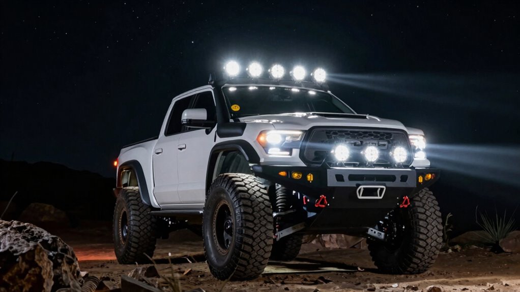 To get the most out of your off-road lights, you need to make sure they’re compatible with your truck’s electrical system. First, check that the lights match your vehicle’s voltage—most trucks run on 12V, but some use 24V systems. Next, review the wattage and amperage requirements to ensure they won’t overload your circuits or strain your alternator and battery. It’s also essential to verify that the wiring harness and connectors are designed for your truck’s electrical standards, which helps prevent connection issues. Additionally, confirm that the power consumption lines up with your vehicle’s capacity, so your electrical system remains stable. Finally, consider mounting options and adjustable features that support your wiring setup for a seamless installation.