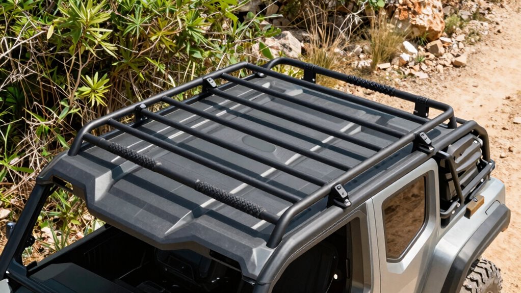 Ever wondered how your UTV roof rack can withstand harsh weather conditions? The key is in its materials—look for racks made from powder-coated steel or anodized aluminum, as these resist rust and corrosion. A good rack should have sealed joints and reinforced seams to handle rain, snow, and humidity without breaking down. UV-resistant coatings protect the surface from sun damage, keeping the finish looking new longer. Drainage channels or drain holes are essential to prevent water buildup, reducing internal corrosion risks. Additionally, wind deflectors or fairings can shield cargo from wind and weather, extending the rack’s lifespan. When choosing a roof rack, prioritize these features to ensure it remains durable and reliable no matter the weather.