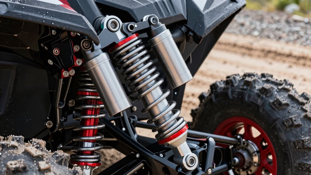 Selecting the right UTV shock type depends on understanding the specific performance needs and riding conditions. Monotube shocks excel in demanding off-road terrains because they dissipate heat better and deliver consistent damping, reducing fade during aggressive rides. Twin-tube shocks, on the other hand, offer a smoother ride and are more budget-friendly, making them suitable for moderate terrain. Coilover shocks provide adjustable spring preload and damping, giving you the flexibility to customize for different terrains and riding styles. Air shocks are highly versatile, allowing easy pressure adjustments for ride height and stiffness, ideal for varying loads and terrains. Ultimately, choosing the right shock type hinges on balancing your riding style, terrain demands, and budget to optimize off-road performance.