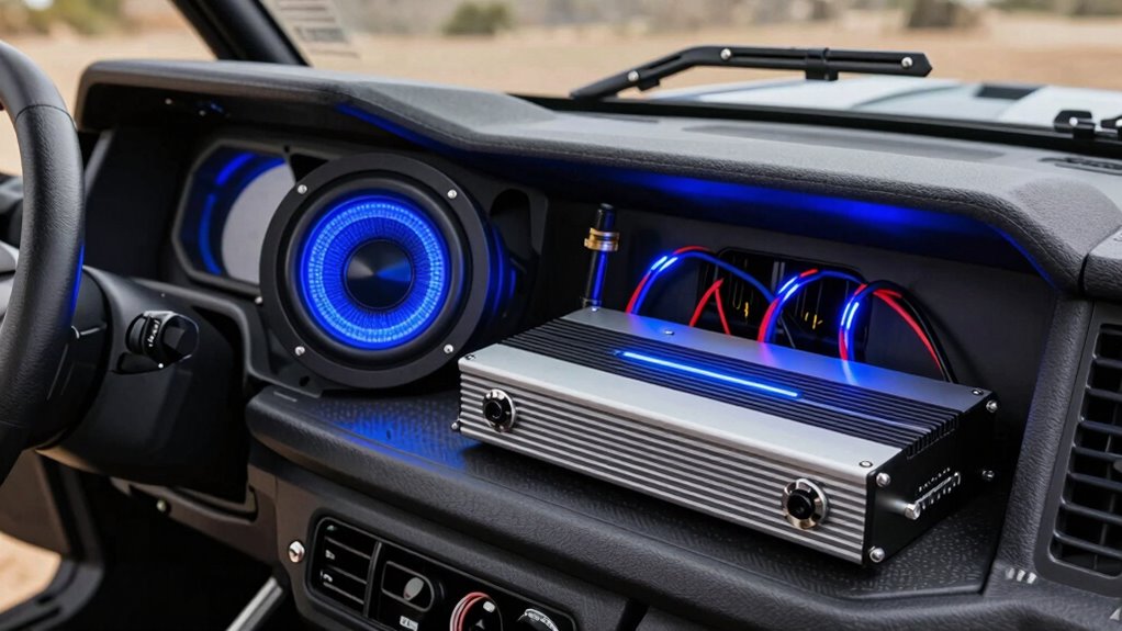 Ensuring your UTV’s subwoofer and amplifier work seamlessly together hinges on matching their power specifications. First, check that the subwoofer’s RMS power matches the amplifier’s output to prevent underperformance or damage. The amplifier’s wattage capacity should be enough to deliver the bass you want without exceeding the subwoofer’s maximum handling. Additionally, verify that your UTV’s power supply can provide the necessary voltage and current for the amplifier to operate efficiently. Impedance matching is also critical; ensure the subwoofer and amplifier share the same ohm rating to optimize power transfer and avoid electrical issues. Ultimately, confirm that the amplifier’s voltage compatibility aligns with your UTV’s 12V system, ensuring reliable performance and longevity.