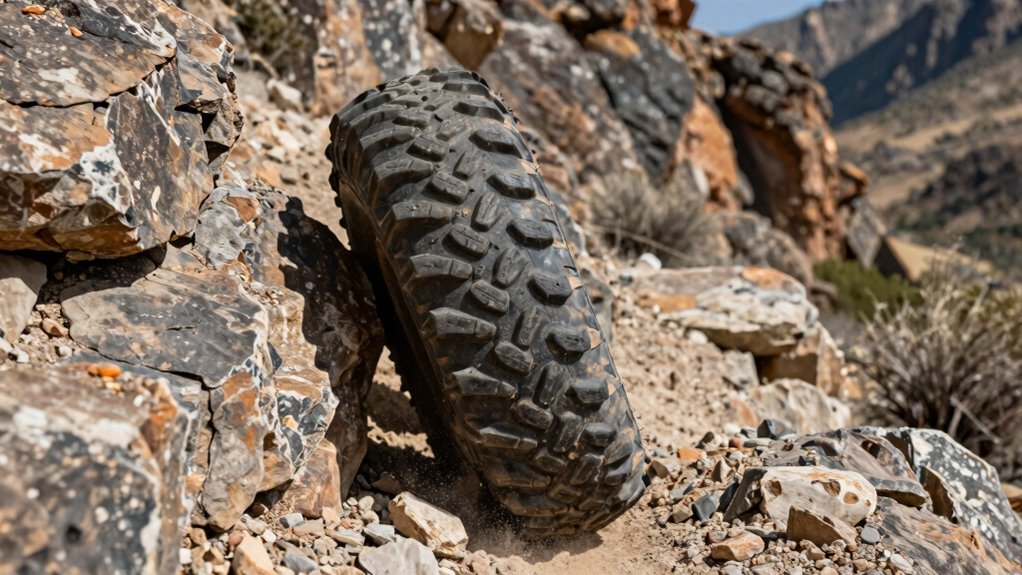 Selecting the right tread pattern is important, but equally vital is ensuring the tires can withstand the rigors of rocky terrain. Tire durability standards are primarily indicated by ply rating and reinforced sidewalls, which help prevent punctures from sharp rocks and trail debris. For rocky environments, look for tires with a high ply rating, typically 6 to 8 ply, offering increased strength and puncture resistance. Heavy-duty, radial construction provides better durability and flexibility, reducing damage during sharp turns and climbs. Specialized rubber compounds also play a key role, offering enhanced cut and abrasion resistance for a longer lifespan. Additionally, aggressive sidewalls with reinforced designs and stepped tread blocks boost resilience, helping tires endure harsh rocky conditions without compromising performance.