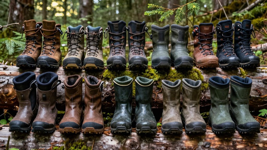 Are your waterproof adventure boots ready to handle the diverse terrains you’ll encounter? To guarantee they’re up to the challenge, check for a reliable waterproof membrane like Gore-Tex or Aqua-Barrier that seals out water on muddy or wet surfaces. Rugged, lugged soles made from durable rubber are essential for grip on uneven, rocky, or slippery terrain. Look for boots crafted from abrasion-resistant materials such as full-grain leather or reinforced microfiber to withstand rough conditions. Reinforced toe caps and shifter guards help protect against impacts on technical trails. Additionally, flexible yet supportive features like billowed flex panels allow your boots to adapt to different terrains without sacrificing stability. This combination ensures you’re prepared for whatever trail throws your way.