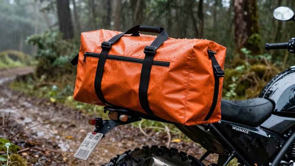 Choosing a waterproof motorcycle duffel bag begins with evaluating the quality of its materials, as this directly impacts how well it protects your gear. High-quality bags are generally made from durable materials like PVC, tarpaulin, or reinforced nylon, which resist water ingress effectively. The best fabrics feature seamless welding or high-frequency heat sealing, preventing leaks at seams and joints. Material thickness, such as 500D or 1000D, also matters—thicker fabrics offer greater resistance to tears, abrasions, and water penetration. Additionally, UV resistance and environmental durability confirm the bag withstands sunlight and harsh weather without degrading. Features like roll-top closures, waterproof zippers, and sealed seams are essential, as they work together to keep your gear dry even during heavy rain or submersion.