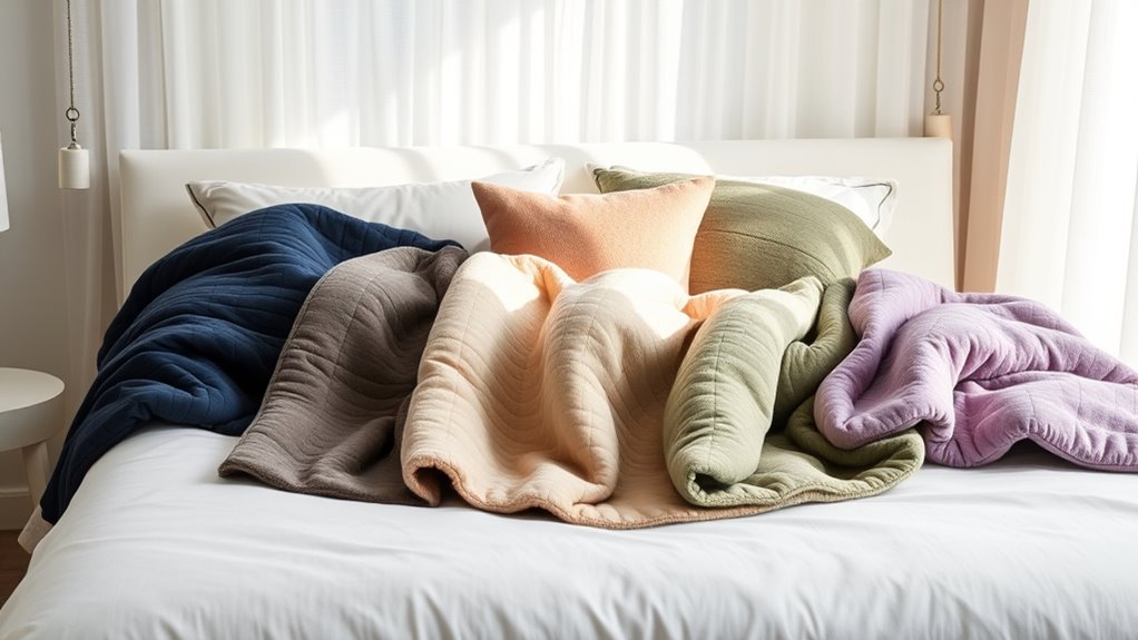 Selecting the right fabric for your weighted blanket plays an essential role in guaranteeing comfort and effective anxiety relief. Breathable fabrics like cotton, microfiber, and bamboo help regulate your body temperature, preventing overheating during sleep. These materials wick away moisture and reduce sweat build-up, decreasing discomfort overnight. Fleece and Sherpa offer warmth and softness, yet they still allow airflow, making them suitable for different seasons. If you’re prone to night sweats or hot flashes, lightweight breathable textiles are especially beneficial. Additionally, fabric choice influences durability and ease of cleaning, which are important for maintaining long-term comfort and hygiene. Ultimately, selecting a breathable fabric assures you stay comfortable, cool, and relaxed, allowing you to maximize the calming benefits of your weighted blanket.