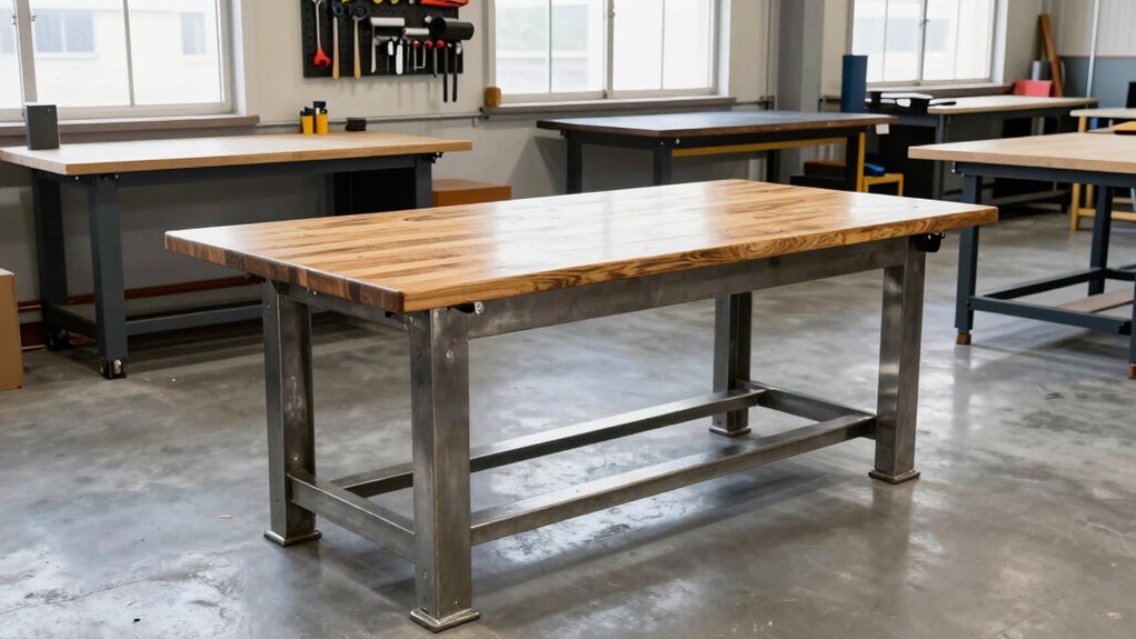 When choosing a heavy-duty workbench, I look at several key factors to guarantee it meets my needs. I consider the load capacity, workspace size, and the durability of the materials to handle tough tasks. Additionally, I check for height adjustment features and power options to make my work more efficient.
